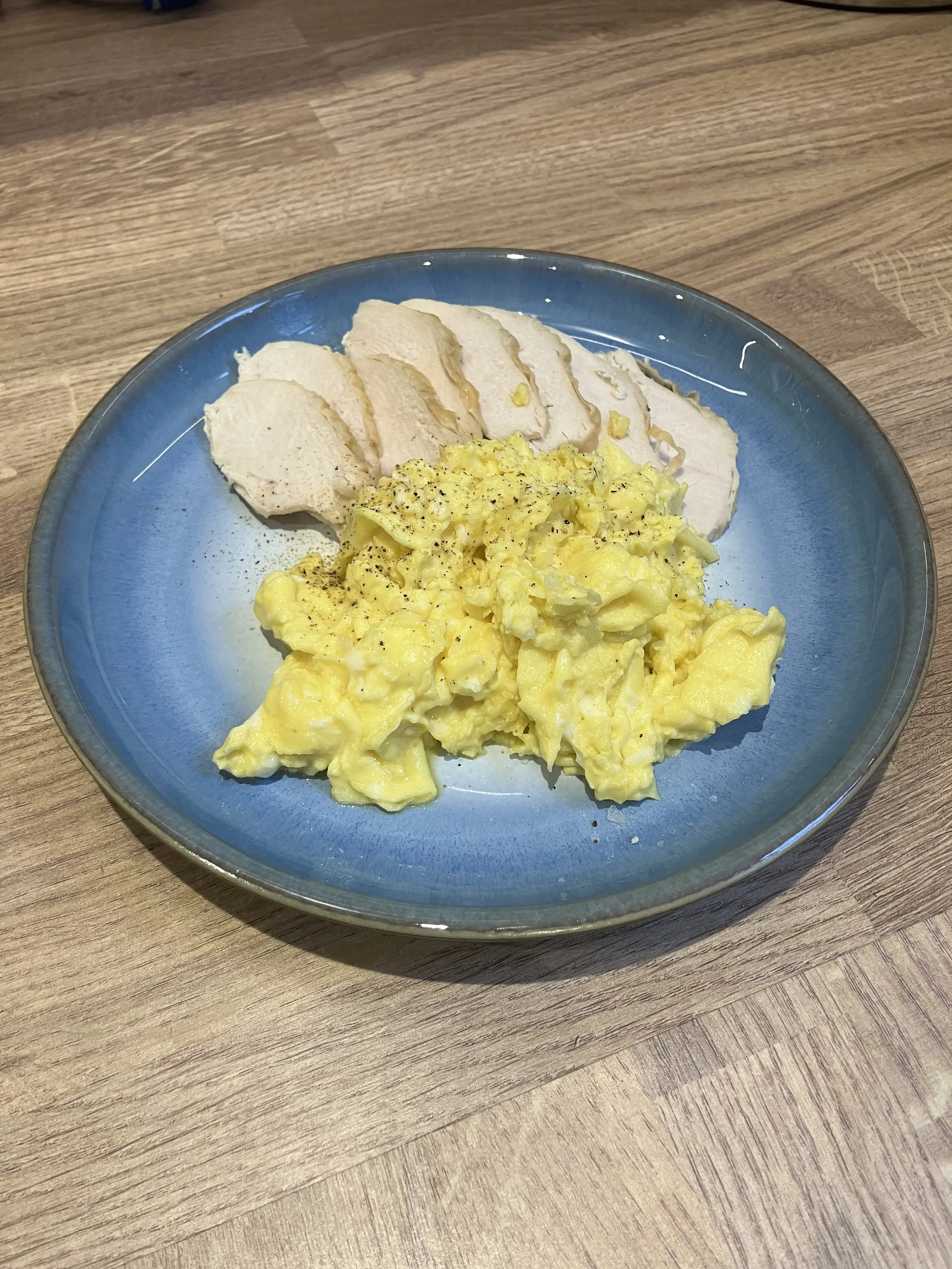 Scramble 3 eggs gently in olive oil. Serve with sliced, pre-cooked chicken breast (skin on), eaten cold. Season with salt and pepper at the end.