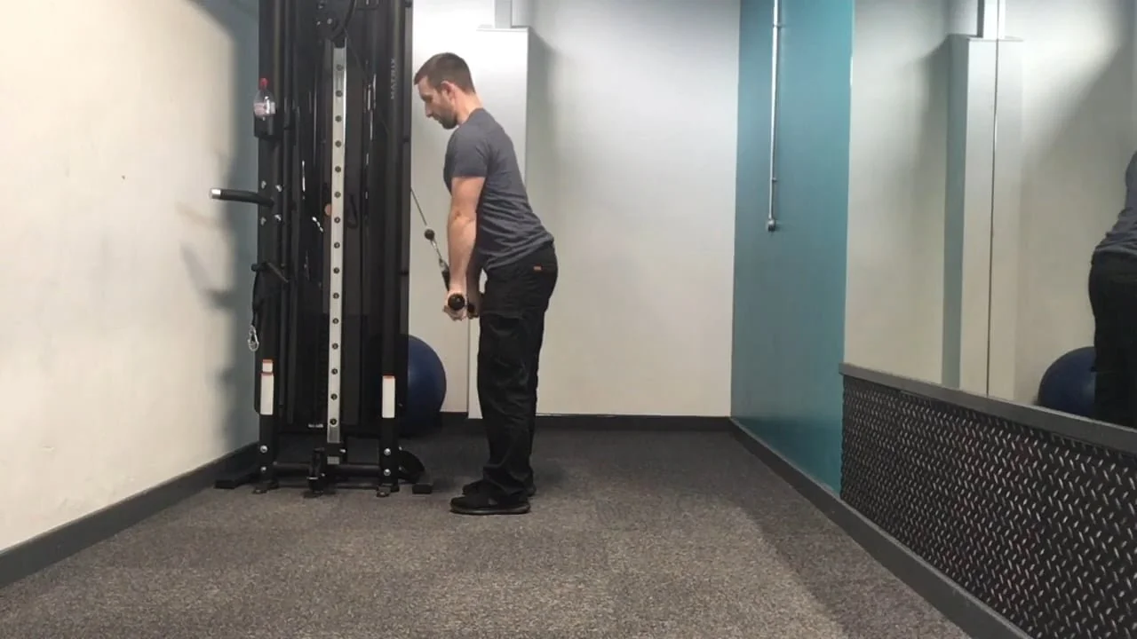 • Stand tall holding the rope attachment on a low pulley, palms facing each other.