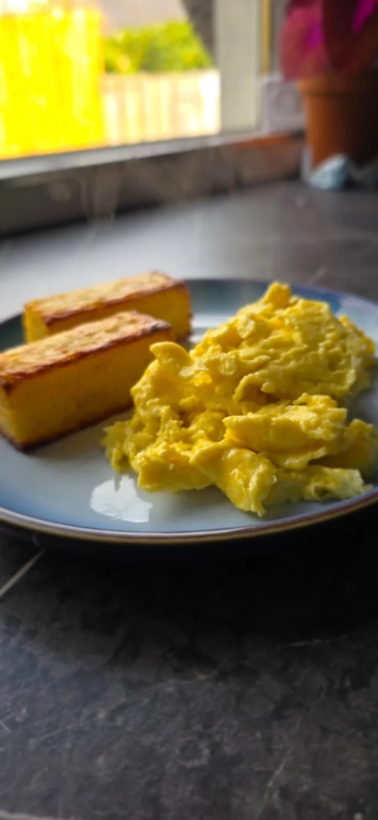 Heat the oil or butter in a non-stick frying pan over medium heat. Shape the potato mix into a flat patty (or two small ones) and gently place in the pan. Cook for 4–5 minutes per side until golden and crisp. Remove and set aside on kitchen paper.Scramble the Eggs: