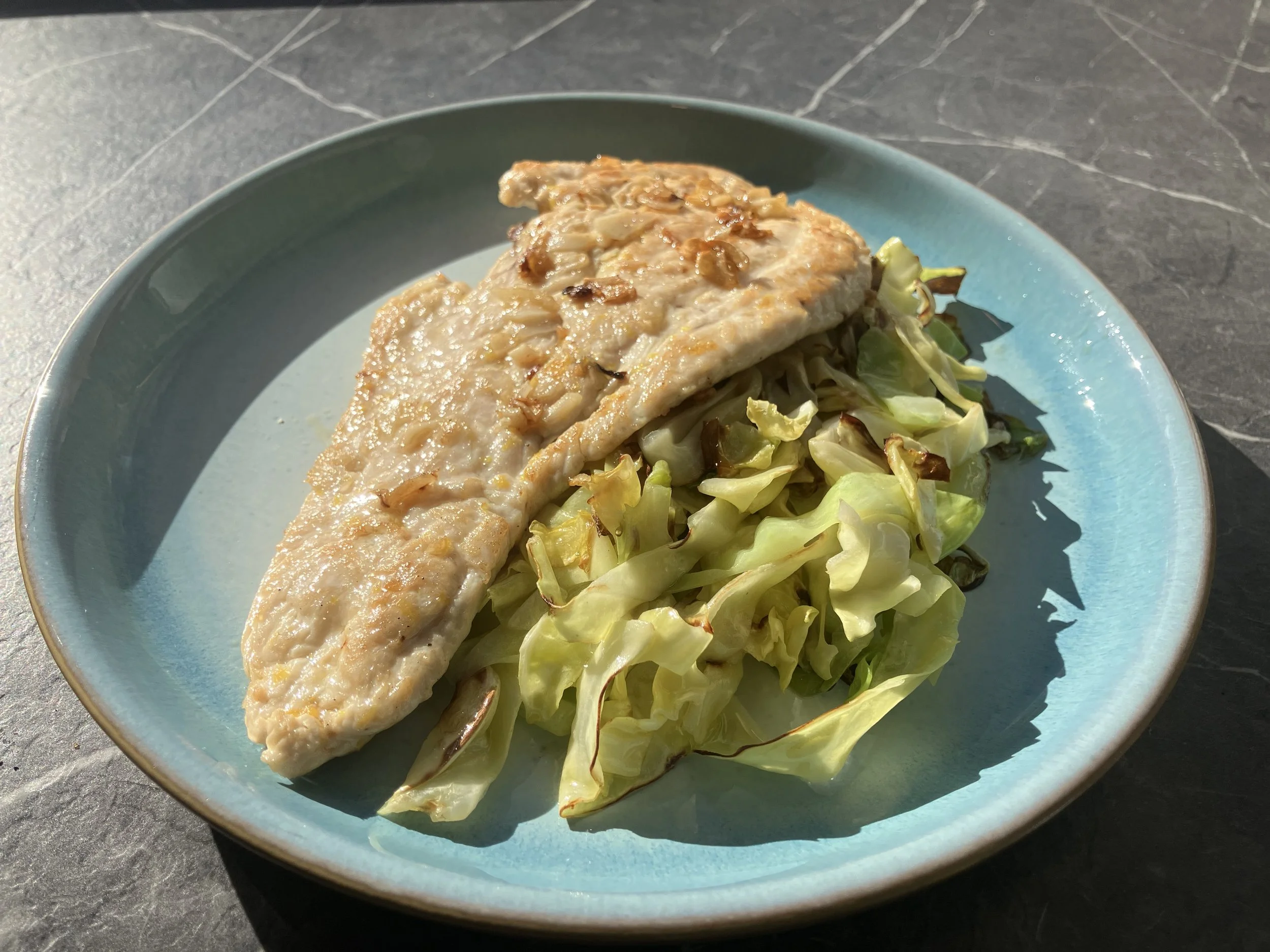 This quick, fresh, and flavorful lunch is all about simplicity and quality ingredients. The halved, butterflied, and beaten-out chicken breast is seasoned with sea salt, organic pepper, and lemon zest for a bright, fragrant kick. Served alongside charred hispi cabbage infused with garlic, this dish is light, satisfying, and ready in minutes.