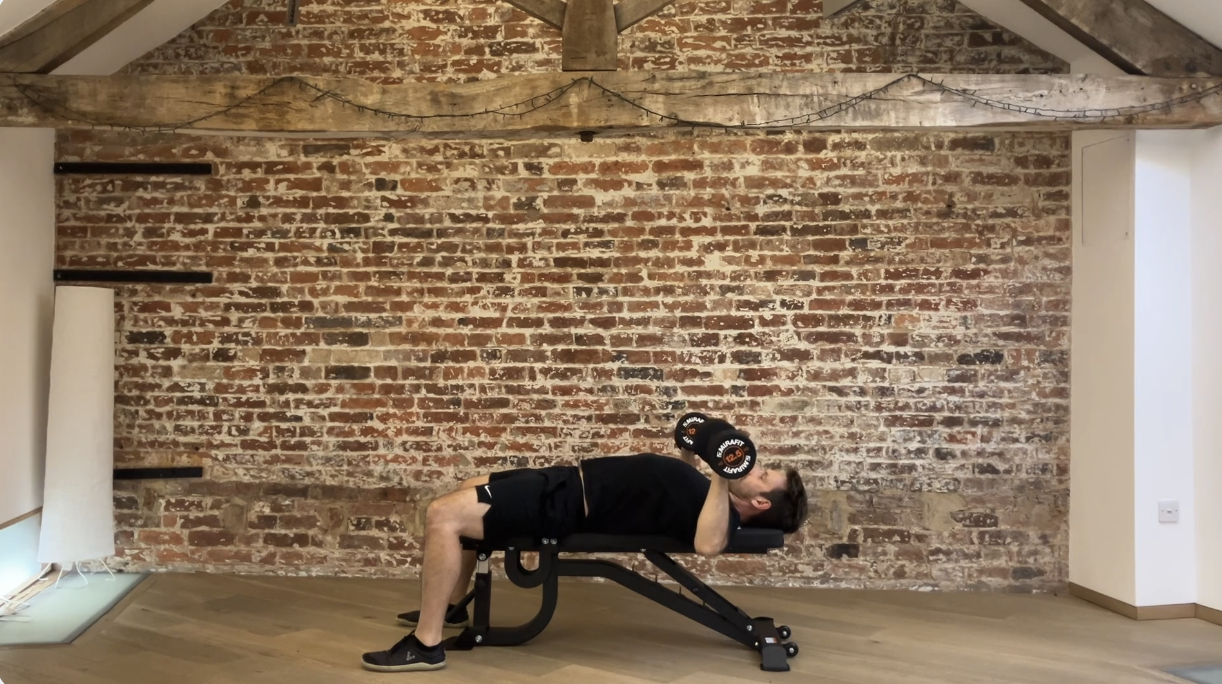 • Lie back on a bench or the floor with a dumbbell in each hand, feet planted firmly on the ground.